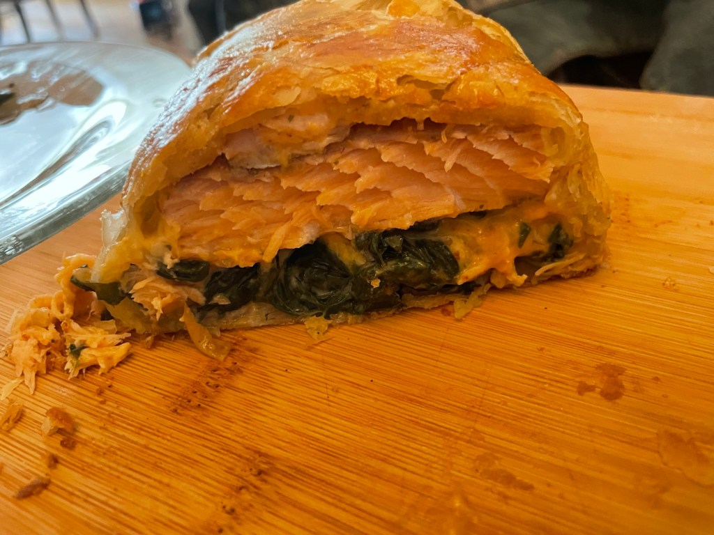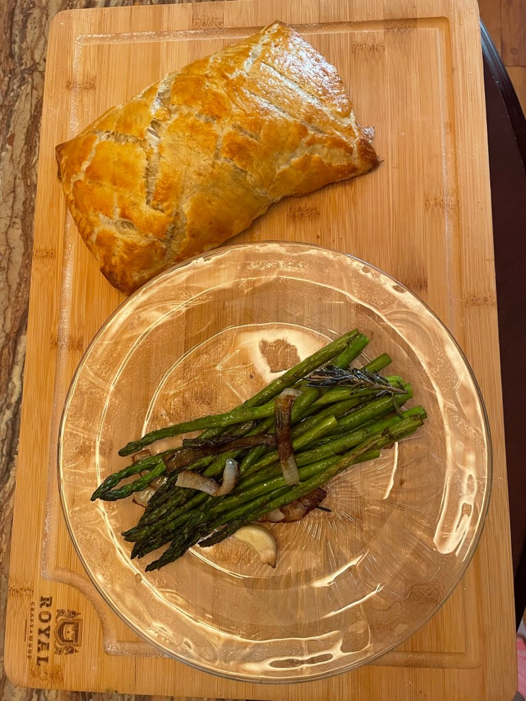 Salmon with spinach and cheese in flaky pastry with a side of garlic asparagus