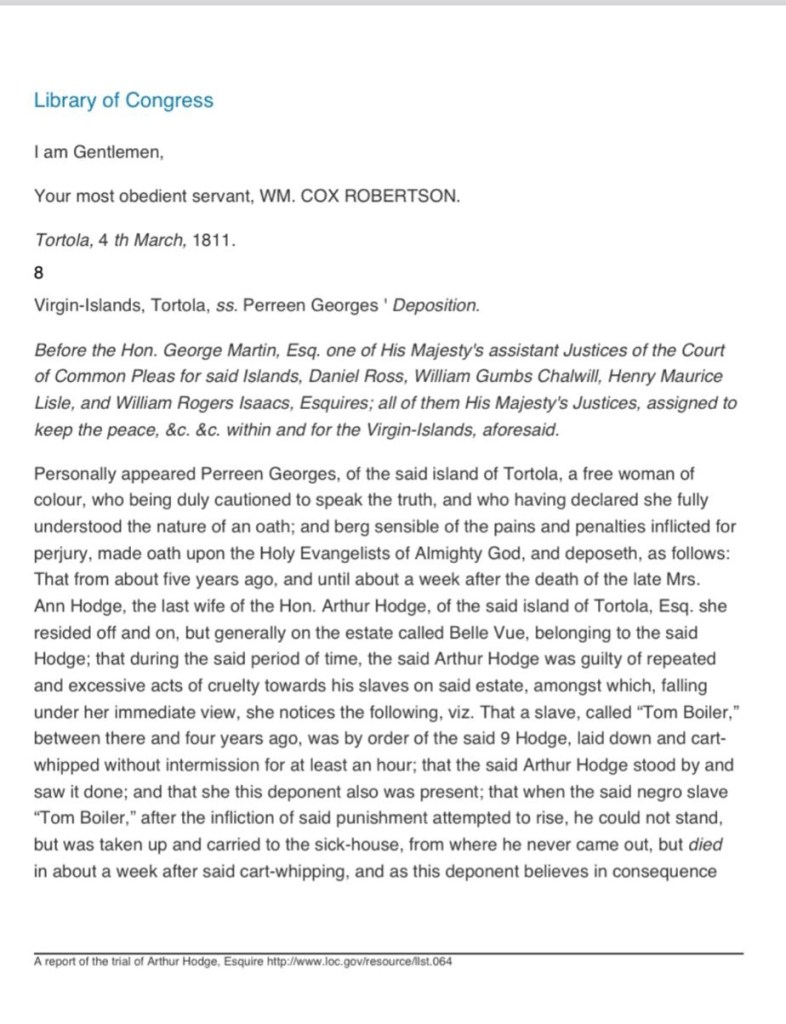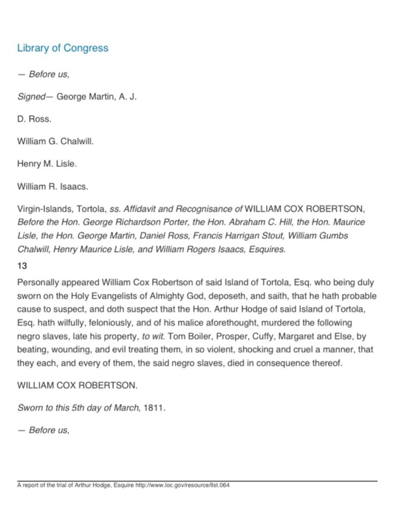 Below is the sworn testimony of William Cox Robertson dated March 4th, 1812 in Tortola.