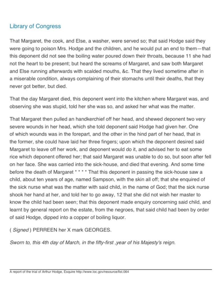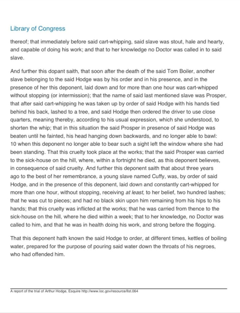 “I was present when he [Prosper] was laid down and flogged for a mango which dropt [sic] off a tree, and which Mr Hodge said he should pay six shillings for; he had not the money and came to borrow it of me, I had no more than three shillings; he said to his master that he had no more money; his master said he would flog him if he did not bring it; he was laid down and held by four negroes, on his face and belly, and flogged with a cartwhip; he was under the last better than an hour; he then got up and was carried up to the hill; and his master said he should be flogged again if he did not bring the other three shillings; he was tied to a tree the next day; and the flogging was repeated; he was licked so long that his head fell back, and he could not bawl out any longer; I supposed he was faint; I then went from the window, as I could not bear to see any more of it.”