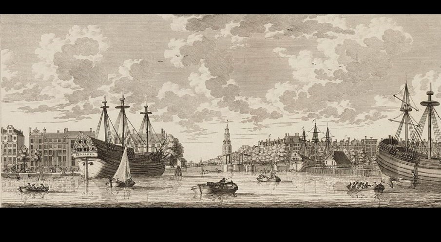 Beeckestijn (left) docked in Amsterdam, c. 1735