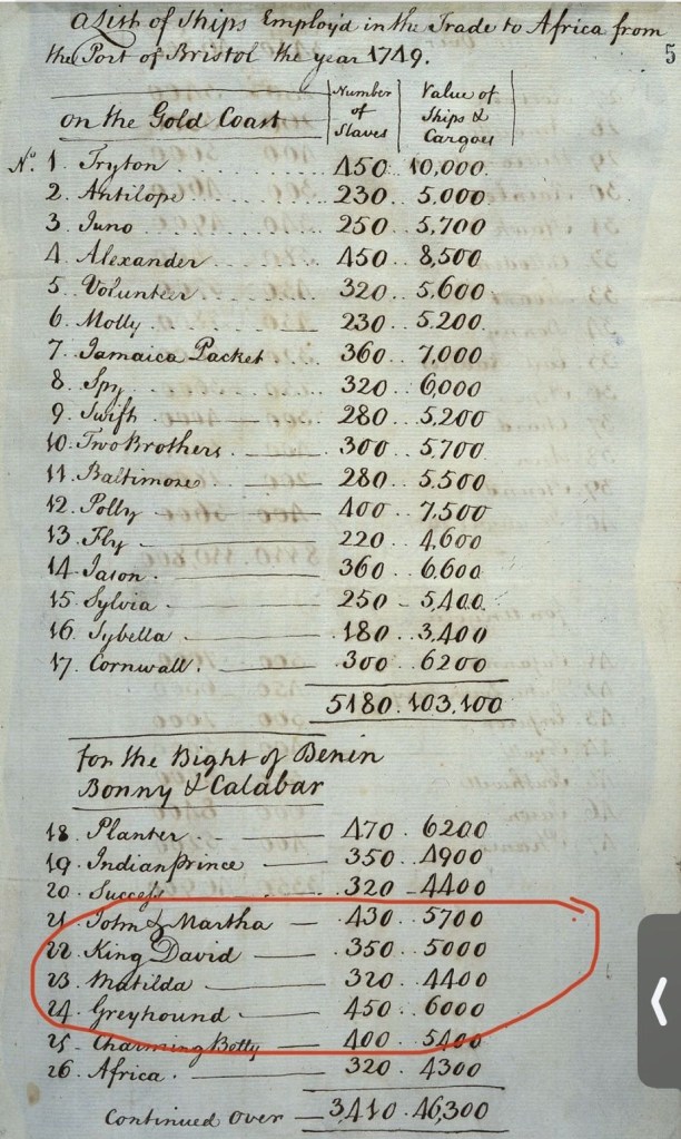 On May 8, 1750, enslaved Africans aboard the King David revolted while the ship was traveling from Calabar to St. Kitts by way of Bristol. At 5am, 15 enslaved Africans broke their chains and launched a coordinated uprising. The Africans on board the King David from Bristol killed the captain and five crew members, and later threw nine more overboard in shackles meant for the slaves, forcing the remaining sailors to flee and hide in the hold.
